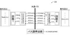 このバス通信システムでは、一定期間、一つのマスタ回路がバスを占有し、スレーブ回路との間でデータ転送を行う。バス調停回路56は、一つのマスタ回路に対してバス転送を許可するものであり、同時に複数のマスタ回路がバスを使用しようとしている場合に、どのマスタ回路に占有権を与えるかを決定する。なお、システムの中でマスタ回路として動作する回路が一つしかない場合には、バス調停回路56は設けなくてもよい。  In this bus communication system, one master circuit occupies a bus for a certain period and performs data transfer with a slave circuit. The