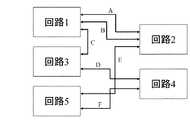 回路1は、同期チャネルAおよびBを介して回路2と接続されていると共に、同期チャネルCを介して回路3とも接続されている。また、回路3は同期チャネルDを介して回路4と接続されている。また、回路2は同期チャネルEを介して回路5と接続されている。さらに、回路5は同期チャネルFを介して回路4と接続されている。  The