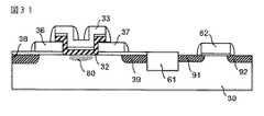 図1に例示される不揮発性メモリセルは、半導体領域例えばp型のウェル領域上30にゲート酸化膜31とゲート窒化膜32が積層され、その上にワード線を構成するメモリゲート電極(メモリゲート)33が形成され、その両側の半導体領域上にゲート酸化膜34,35を介してスイッチ制御線を構成するスイッチゲート電極(サイドゲート)36,37が形成され、夫々のスイッチゲート電極36,37下近傍の前記半導体領域にソース又はドレイン電極とされる信号電極38,39が形成される。前記ゲート窒化膜32及びメモリゲート電極33とスイッチゲート電極36,37との間には層間絶縁膜40が介在されている。