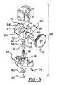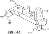 特に図14A及び図14Bを参照して、アクチュエータ102をより詳細に説明する。アクチュエータ102は、ベース部分104と、このベース部分104から延びる少なくとも1つの係合アーム106とを含んでいる。アクチュエータ102の少なくとも1つの係合アーム106は、滅菌中、ポンプ入口32及びポンプ出口34を開状態に保持するようにポンプ組立体28に作動的に係合する。更に詳細には、本発明の好ましい実施形態では、アクチュエータ102は、ベース部分104から延びる第1の係合アーム108及び第2の係合アーム110を含んでいる。好ましい実施形態では、アクチュエータ102はまた、作動アーム112を含んでいる。作動アーム112は、第1の係合アーム108と第2の係合アーム110との間をベース部分104から延びている。図面に示すように、作動アーム1112は、第1の係合アーム108と第2の係合アーム110との間をベース部分104から上方に延びている。  The