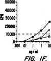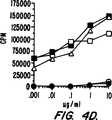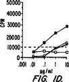 図1A-1Fは、12人の異なる提供者のうちの3人の代表的な応答を示すグラフである。ペプチド965.10(黒い四角)、906.09(白い四角)、760.50(黒い丸)か又はテタヌストキシ830-843(白い丸)の添加により0日目に生じたヒトPBMC T細胞系からの抗原特異T細胞応答を、14日目(2回目の刺激、図1A、図1B、図1C)及び28日目(3回目の刺激、図1D、図1E、図1F)に分析した。代表的な2つの独立した実験を示す。