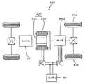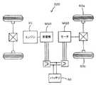20,120,220,320  ハイブリッド自動車、22  エンジン、24  エンジン用電子制御ユニット(エンジンECU)、26  クランクシャフト、28  ダンパ、30  動力分配統合機構、31  サンギヤ、32  リングギヤ、32a  リングギヤ軸、33  ピニオンギヤ、34  キャリア、35,減速ギヤ、40  モータ用電子制御ユニット(モータECU)、41,42  インバータ、43,44  回転位置検出センサ、50  バッテリ、51  温度センサ、52  バッテリ用電子制御ユニット(バッテリECU)、54  電力ライン、60  ギヤ機構、62  デファレンシャルギヤ、63a,63b,64a,64b  駆動輪、70  ハイブリッド用電子制御ユニット、72  CPU、74  ROM、76  RAM、80  イグニッションスイッチ、81  シフトレバー、82  シフトポジションセンサ、83  アクセルペダル、84  アクセルペダルポジションセンサ、85  ブレーキペダル、86  ブレーキペダルポジションセンサ、88  車速センサ、230  対ロータ電動機、232  インナーロータ  234  アウターロータ、MG1,MG2  モータ。  20, 120, 220, 320 Hybrid vehicle, 22 engine, 24 engine electronic control unit (engine ECU), 26 crankshaft, 28 damper, 30 power distribution integration mechanism, 31 sun gear, 32 ring gear, 32a ring gear shaft, 33 pinion gear, 34 carrier, 35, reduction gear, 40 motor electronic control unit (motor ECU), 41, 42 inverter, 43, 44 rotational position detection sensor, 50 battery, 51 temperature sensor, 52 battery electronic control unit (battery ECU), 54 power line, 60 gear mechanism, 62 differential gear, 63a, 63b, 64a, 64b drive wheel, 70 electronic control unit for hybrid, 72 CPU, 74 ROM, 76 RAM, 80 ignition switch , 81 shift lever, 82 shift position sensor, 83 accelerator pedal, 84 accelerator pedal position sensor, 85 brake pedal, 86 brake pedal position sensor, 88 vehicle speed sensor, 230 to rotor motor, 232