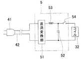 図5において、前記直流電源回路5は、商用交流電源接続用プラグ(図1)41を有する電源コード42を介して入力された商用交流電源電圧を所定電圧の直流に変換する直流変換部51と、直流変換部51からの電力供給により充電されるとともに、前記コイル32に並列接続されたコンデンサ52と、直流変換部51からコンデンサ52への入力ラインに介挿されたリアクトル53と、コンデンサ52とコイル32との間に介挿されたスイッチ素子54とを備えており、前記スイッチ素子54を閉じることにより、コンデンサ52に充電された電荷がコイル32へと放電され、この放電により、コイル32が磁界を発生するものとなされている。