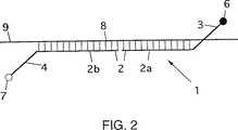 本発明のハイブリダイゼーションプローブは、DNA、RNAまたはこれら二つの組み合わせからなる。プローブは修飾ヌクレオチドを含むこともできる。プローブにおけるヌクレオシド間の結合は、ホスホジエステル結合以外の結合を含んでもよい。図1は、ユニタリープローブ1の二分子バージョンを図式的に示す。プローブ1は、5’末端と3’末端とを有する一本鎖標的相補配列2を含み、二分子プローブ1に配列2aと配列2bとを含み、これらは共に核酸標的鎖内に含まれる予め選択された標的配列に相補的である。プローブ1は、一本鎖、すなわち単一分子バージョンと見なされ、単一標的相補配列2はそのほぼ中部に配されている。以下の記載は、プローブ1がこのように考えられたものとして、すなわち簡便のために単一分子バージョン考えられたものとして記載する。しかして、本記載は、二分子および単一分子バージョンの両方に適用される。