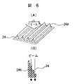 ブラッグピーク拡大装置17を通過したイオンビームはリッジフィルタ24に達する。リッジフィルタ24は、図6(A)に示すように、縦断面が楔形状をした複数のフィルタ要素(楔形要素)24Aを並列に配置して構成される。フィルタ要素24Aは約1cmピッチで配置される。各フィルタ要素24Aの底面を除いた二面の表面には、図6(B)に示すように、多数の段部34が形成される。リッジフィルタ24を通過したイオンビームは、多数の段部34を形成した複数のフィルタ要素24Aによってフィルタ要素24Aの透過した部分の厚みに応じたエネルギーの異なる多数のイオンビーム成分、すなわち段部34の数だけエネルギーが異なるイオンビーム成分を含んでいる。このため、体内の深さ方向における異なる位置で段部34の数だけブラッグピークを形成することができる。