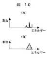 フィルタ要素18,21の棒状部19,22の縦断面の形状を、円または三角形にしてもよい。縦断面の形状が円である複数の棒状部を有する2つのフィルタ要素をそれぞれの棒状部が上から見て交差するように配置したブラッグピーク拡大装置を用いた場合には、そのブラッグピーク拡大装置を通過したイオンビームは図10(A)に示すようなエネルギーが異なるイオンビーム成分を含む。また、縦断面の形状が三角形である複数の棒状部を有する2つのフィルタ要素をそれぞれの棒状部が上から見て交差するように配置したブラッグピーク拡大装置を用いた場合には、そのブラッグピーク拡大装置を通過したイオンビームは図10(B)に示すようなエネルギーが異なるイオンビーム成分を含む。