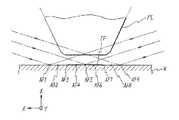 そこで、このスキャン型投影露光装置を用いて感応基板を露光する場合は、例えば、特開平6−283403号公報等に記載されているように、露光フィールドに対して走査方向の手前側に設けられた1列全ての検出点をサンプル点として、予め露光前にそのサンプル点でのフォーカス位置の値を全て計測し、平均化処理やフィルタリング処理を行って、位相遅れを見込んで露光時にオープンでオートフォーカス及びオートレベリング機構を制御する。そして、それと並行して上記1列の各サンプル点でのフォーカス位置の計測値から最小自乗近似法で非スキャン方向の傾きを求め、非スキャン方向のレベリング制御をオープン制御で行う、いわゆる完全先読み制御法が実施されていた。