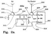 図2Aの抵抗素子216、220において終端されていた信号エネルギーは、代わりに、副たるトランシーバー221の受信ポートに入力される。さらに、副たるトランシーバーユニットは、デュープレックスポート222に出力される信号を送信できる。これらの信号は第2のサーキュレータ205の第3のポート215に入力されて、第2のアンテナ203へ出力すべく、サーキュレータ205の第1のポート212に出力される。このケースにおいて、両方のアンテナ202、203はデュープレックスアンテナとして動作する。