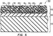 図3を参照すると、図1に記載した積層構成体10に類似しているが、エラスチックの導電層16の面に導電性の押しくぼませる粒子32をしっかりはめ込んである積層構成体30の断面が示してある。該導電性の押しくぼませる粒子32は、前記サーマルサイクル(熱処理)に先立ってエラスチックの導電層16の面に施されるものであり、その結果、該粒子32は、前記導電層が完全にキュアーすると、エラスチックの導電層16にしっかり保持される。導電性の押しくぼませる粒子32の押しくぼませるのインデントする形態によって、エラスチックの導電層16に接触すべき導電面に形成される絶縁性酸化物が押し退けられ、この結果、導電面とエラスチックの導電層16との間に改善された電気接続が形成される。前記導電性の押しくぼませる粒子32は、相手の導電面に存在する繊維及び粒子のような他の汚染物を押し退ける点に注目すべきである。