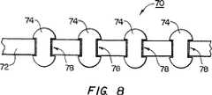 図8を参照すると、開口78を配列形成した絶縁基体72を備える相互接続デバイス70の断面が示されている。エラスチックの導電性相互接続エレメント74が各開口78内に配置されている。このような相互接続デバイス70は、例えば、リードレス集積回路パッケージの電気接点と、プリント回路基板の電気接点とを電気的に接続するために用いられるものである。これら電気接点は、ボール又はランドグリッド配列バラエティを有している。