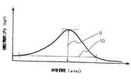 の式に従ってヘッドが戻される力、即ち衝撃力を算出する。加速度ピックアップはBrueel & Kjaer社製のAcceler type4374を使用し、ドライバー(衝撃力測定用に加工された住友ゴム工業(株)製のDP-901)およびパター(衝撃力測定用に加工された住友ゴム工業(株)製のMAXFLI TM-8)ともにシャフト軸に垂直に、かつボール打点(フェース中心)の真裏に設置した。図2および図3にそれぞれ示すように、ドライバー(7)およびパター(8)に上記のように加速度ピックアップ(4)を取り付けて打撃し、チャージアンプ(5)で加速度を読み取り、デジタルオシロスコープ(6)により、衝撃力の経時変化を示す図4のようなグラフを得た。得られた曲線のピークでの衝撃力を最大衝撃力(9)とし、曲線の立ち上がりからベースラインに戻りきるまでの時間を、ボールがクラブのフェースに接触している時間、即ち接触時間(10)とする。チャージアンプはBrueel & Kjaer社製のcharge amplifier type2635、デジタルオシロスコープはIWATSU社製のDS6612を用いた。
