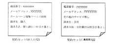 図2には、同一の携帯電話使用者が契約する個人用の契約セット21と業務用の契約セット22の一実施例が示されている。個人用の契約セット21は、電話番号、電子メールアドレス(電子メールサービス)、ホームページ閲覧サービスを含み、請求先を個人、請求方法を個人の銀行口座からの引き落としとしている。業務用の契約セット22は、個人が属する会社と携帯電話会社が契約したものであり、電話番号、電子メールアドレス(電子メールサービス)を含み、請求先を会社、請求方法を、会社の銀行口座からの引き落としとしている。