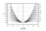 まず、図4に示した、座標(x,1)の樹脂を積層する場合について図8、図9を用いて説明する(xは、1〜8の整数である。)。説明の簡略化のため、座標(x,1)にある樹脂をそれぞれ樹脂Fxとする。かかる決定方法は、前記図3で説明した第1の実施形態における水平方向の樹脂の決定方法と、水平方向の屈折率分布の変化方向が逆(即ち、第2の実施形態は、中心から左右に向かって屈折率が増加している)である点を除き、他の点は、同一である。図8において、縦軸は樹脂の屈折率n、横軸は光制御手段4の中心からの距離Wである。また、符号イ〜リに示すパラメータは、屈折率分布定数A1/2であって、符号イからリの屈折率分布定数A1/2は、それぞれ、0.1、0.2、0.3、0.4、0.5、0.6、0.7、0.8、0.9である。
