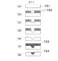 図15に、本発明の磁気ヘッドの主磁極の製造工程の該略図を示す(但し、図の拡大倍率は均一では無い)。再生ヘッド部は省略している。(a)の無機絶縁膜151上にレジストパターン152を形成したところを(b)に示す。無機絶縁膜は、従来用いられているAl2O3を用いたが、他にSiC、AlN、Ta2O5、TiC、TiO2、SiO2等が使用可能である。レジストパターンは、KrFエキシマレーザーステッパを用いて露光を行い、レジストとしては、東京応化工業(株)製ポジレジストTDUR−P201を用いた。レジスト膜厚0.7μmを用いた場合、0.2μmが解像できた。このレジストパターンをマスクとして用いて、無機絶縁膜を異方性のエッチングを行ったところを(c)に示す。
