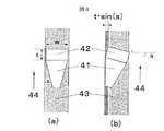 本実施例では、主磁極は二つの部分からなっており、媒体移動方向44の上流側に当たる第1の部分41はリーディング側からトレーリング側に向けて幅が連続的に増加しており、この部分の厚さは350nm、トレーリング側の幅wは250nmである。媒体移動方向44の下流側に当たる第2の部分42は第1の部分41の媒体のトレーリング側の幅と同じ幅wで形成され、リーディング側からトレーリング側に向けて幅が同じである。すなわち、リーディング側からトレーリング側に向かう第2の部分42のトラック幅方向の長さは変化せず、第1の部分のリーディング側からトレーリング側に向かうトラック幅方向の長さの変化は不連続となる。より具体的に説明すると、図4の(a),(b)で、第1の部分においては、トラック幅方向の長さはリーディング側からトレーリング側へ向かう方向に対して連続的に増加しているので、トラック幅方向の長さの変化率はゼロでない一定値である。一方、第2の部分においてはトラック幅方向の長さは変化しないので、第2の部分のトラック幅方向の長さの変化率は0となる。第2の部分のトレーリング側の端辺の垂線と第1の部分のトラックエッジ側の側辺とのなす角度xは10°である。本実施例に用いた磁気ディスク装置の最大ヨー角は10°であった。これは、前記角度xと一致している。第2の部分の厚さtは100nmとした。これは、ヨー角の最大値s=10°、トラックピッチT=300nmとするとき、t≦0.25・T/(sin(s))を満たす。