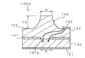この問題を解決するため、図10に示す発光素子100cは、発光素子表面105にメサ構造106を設けたものである。このとき、入射角が全反射角以上の光(例えば、矢印で示す経路e,f)を、素子100c外部へと取り出すことが可能となり、発光素子100cの輝度が向上する。