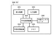 図1の情報処理装置(PC)200において、201は、CRTや液晶モニタ等の表示装置である。203は中央処理装置(CPU)で、入力装置202からの入力処理を外部記憶装置204に記憶されるOSが各種のアプリケーションをメモリ205上にロードして、その実行処理を制御することにより、所望のデータ処理,画像処理を実行可能に構成されている。入力装置202は、キーボードやマウス等のポインティングデバイスに対応している。外部記憶装置204は、ハードディスク等の不揮発性の大容量メモリであり、各種プログラム(本発明の文書管理アプリケーションも含む)や、データファイルが格納されている。本実施形態で説明される印刷属性付きデータファイル(印刷属性付き文書ファイルや、印刷属性付き画像ファイル)や、印刷属性が付いていない従来のデータファイルなどが、OSに管理されたディレクトリ構造で格納されている。206は外部装置との通信を行う外部インタフェースである。