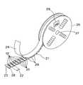 図15は、図14のパーツカセット11に装着されたリール26の詳細を示している。リール26は、パーツカセット11に回転可能に取付けるための円筒状の中心穴27を含む一対の円板状部材によって構成され、両円板状部材の間にキャリアテープ21が巻き付けられている。キャリアテープ21には、多数の部品12が一定間隔22で連続的に収納されている。キャリアテープ21は、部品12を収納する凹状のエンボス部28を有するベーステープ23と、部品12の脱落を防ぎ、埃などから部品12を保護するトップテープ24とから構成されている。上述のように、トップテープ24はベーステープ23に接着されて部品12を保護した状態で搬送され、部品実装装置へ部品を供給する際にはベーステープ23から剥がされる。ベーステープ23には、キャリアテープ21を間欠搬送する際に前記駆動輪33によって駆動される搬送穴25が等間隔に設けられている。なお、微小部品に対してはエンボス部28が設けられることなく、単にキャリアテープ21を打ち抜いた中に部品が収納されることもある。この場合、底面はカバーテープで覆われる。  FIG. 15 shows details of the