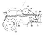 図16は、リール26から引き出されたキャリアテープ21がパーツカセット11内部で搬送される際の概要を示している。キャリアテープ21は、リール26から引き出された後、搬送路30上を図示の例ではパーツカセット11の右側に位置する部品取り出し位置32に向けて駆動輪33の駆動により搬送される。図16に示すパーツカセット11では、モータ39の回転によりウォームギア49を介して駆動される形式の駆動輪33が使用されている。部品取り出し位置32の直前では、トップテープ24がキャリアテープ21から剥ぎ取られ、回収リール34に巻き取られている。  FIG. 16 shows an outline when the
