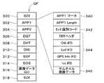 画像ファイルGFは、圧縮データの先頭を示すSOIマーカセグメント300と、Exifの付属情報を格納するAPP1マーカセグメント302と、Exif拡張データを格納するAPP2マーカセグメント304と、量子化テーブルを定義するDQTマーカセグメント306と、ハフマンテーブルを定義するDHTマーカセグメント308と、リスタートマーカの挿入間隔を定義するDRIマーカセグメント310と、フレームに関する各種パラメータを示すSOFマーカセグメント312と、スキャンに関する各種パラメータを示すSOSマーカセグメント314と、圧縮データの終了を示すEOIマーカセグメント318と、画像データ格納領域316とを含んでいる。