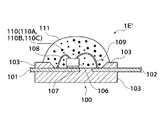 また、本発明においては、例えば、赤色蛍光体110Aと、緑色蛍光体110Bと、青色蛍光体110Cとを組み合わせた3色混合型の蛍光体を透明な樹脂に含有させた場合、封止体111は「白色」の色調を有する。つまり、非点灯時に「白色」であり、点灯すると白色光を放出する点で、「見栄え」が良く各種の用途に応用するに際して視覚的に極めて有利である。