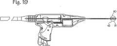 図20は、他のコア採取機構を示し、前図のモータの代わりであるガスタービン83を示す。このタービンは付着プローブからの排気ガスによって駆動され、これにより電気モータの必要性がなくなる。フレキシブルチューブ84が付着チューブの排気径路またはカップリング85を貫通するガス供給ラインに接続され、またタービンに接続されて、排気ガスをタービンに導いている。適切なタービンガス制御弁86を使用してタービンへのガス供給を制御してもよい。カニューレ20は、電気モータに使用された同じタイプのピニオンギヤと駆動ギヤ配置を使用して、ガスタービンに回転可能に連結されている。図21はタービン駆動のコア採取機構の他の例を示し、ここではタービンは、前記実施形態のキャリッジの場所でカニューレに直接装着され、ハウジング内でスライド可能に装着されている。配管87はフレキシブルであり、これにより操作中のタービンの先端および後端への平行移動が許容される。図20と図21のタービン駆動装置は、図4および図13の生体検査器具およびガンと同様に使用することができる。
