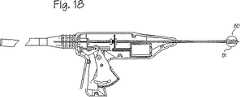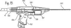 カニューレ平行移動機構は、基端位置76と先端位置77をとる。図14は基端位置にある平行移動機構を示し、ここでカニューレは腫瘍に係合していない。基端位置では、キャリッジ65はトラック66の基端に位置し、付着プローブ1の穿通セグメント3は露出して、カニューレから先端側に延びている。図15は先端位置にある平行移動機構を示し、カニューレは付着プローブの穿通セグメント上で先端側に平行移動され、ここで穿通セグメントに固定された腫瘍と係合して腫瘍を採取する。平行移動機構を先端位置に移動するために、トリガー52を押圧する。トリガーを押圧すると、トリガーが回動軸ピン68の回りに回転し、アーム62とレール67をトラックの先端に前進させ、これによりキャリッジをトラックの先端に前進させる。キャリッジがトラックの基端から先端に前進すると、カニューレ20はガン50の基端から先端に前進する。カニューレが前進したときに付着プローブの先端に付着した組織は、周辺障害部から採取され、装置内で除去される。