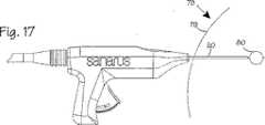 図15はさらに、カニューレ20のルーメン23内の適所にある付着プローブ1を示す。付着プローブをカニューレの基端開口21からルーメンに挿入し、該ルーメンを貫通させる。付着プローブをガン50に固定するために、付着プローブのハンドル4をスナップ結合部53にスナップ嵌合する。ガスおよび/または液体源は供給ラインを介してハンドルに接続する。