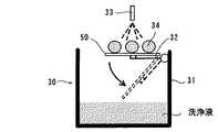 図15は被膜形成装置の処理ステーションS2のうち洗浄部30の断面図であり、洗浄部30には洗浄槽31内にトレイ保持部32が傾動可能に取り付けられ、トレイ保持部32を水平にした状態で、ノズル33から洗浄液をトレイ50上面に供給するとともにテフロン(登録商標)製のブラシ34で洗浄する。洗浄後はトレイ保持部32を斜めにして洗浄液を洗浄槽31内に戻す。洗浄方法としてはトレイ保持部32を傾斜させた状態でブラシ34で洗浄し、或いは洗浄液中に浸漬してもよい。