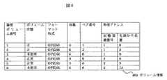 ボリューム情報400は、論理ボリュームを管理する情報であり、ボリューム状態、フォーマット形式、容量、ペア番号、物理アドレスを保持する。図4にボリューム情報400の一例を示す。ボリューム情報400は、ホストアダプタ110およびディスクアダプタ120から参照可能なメモリ、例えば管理メモリ140に保存される。ボリューム状態は、“正常”、“正”、“副”、“異常”、“未使用”のいずれかを保持する。ボリューム状態が“正常”もしくは“正”である論理ボリューム230は、ホストコンピュータ180から正常にアクセス可能な論理ボリューム230であることを示す。ボリューム状態が“副”である論理ボリューム230は、ホストコンピュータ180からのアクセスを許可してもよい。ボリューム状態が“正”である論理ボリューム230は、データの複製が行われている論理ボリューム230であることを示す。ボリューム状態が“副”である論理ボリューム230は、複製に使用されている論理ボリューム230であることを示す。ボリューム状態が“異常”の論理ボリューム230は、障害により正常にアクセスできない論理ボリューム230であることを示す。障害とは、例えば、論理ボリューム230を保持する記憶装置150の故障である。ボリューム状態が“未使用”の論理ボリューム230は、使用していない論理ボリューム230であることを示す。ペア番号は、ボリューム状態が“正”もしくは“副”の場合に有効であり、後述するペア情報500を特定するためのペア番号を保持する。図4に示す例では、論理ボリューム1は、フォーマット形式がOPEN3、容量が3GB、記憶装置番号1の記憶装置150の記憶領域の先頭からデータが格納されており、アクセス可能であり、データの複製対象であることを示す。