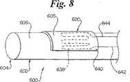 図8は、本発明の更に別の例示の実施例によるカテーテル600の斜視図である。カテーテル600は、血管内の易損性プラーク付着物の位置のマッピングに使用できる。カテーテル600は、細長いシャフト602を含む。このシャフトは、先端604、基端(図8には示さず)、及び外面606を有する。センサ620が細長いシャフト602の外面606に重なるように配置されている。図8の実施例では、センサ620は可撓性基材640及び導電路638を含む。この導電路638は第1導体642及び第2導体644に接続されている。好ましい実施例では、導電路638の電気抵抗は温度に従って変化する。更に、好ましい実施例では、第1導体642及び第2導体644は絶縁されている。第1導体642及び第2導体644は、例えば、細長いシャフト602に重ねた収縮チューブ層によって絶縁されている。図8の実施例では、センサ620は全体に円筒形の外面605を有する。好ましい実施例では、外面605の形状は、センサ620が血管内面と大部分の領域に亘って接触するように選択される。  FIG. 8 is a perspective view of a catheter 600 according to yet another exemplary embodiment of the present invention. The catheter 600 can be used to map the location of vulnerable plaque deposits within the blood vessel. Catheter 600 includes an elongate shaft 602. The shaft has a