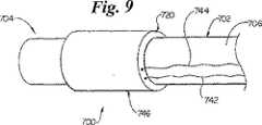 図9は、本発明の更に別の例示の実施例によるカテーテル700の斜視図である。カテーテル700は、血管内の易損性プラーク付着物の位置のマッピングに使用できる。カテーテル700は、細長いシャフト702を含む。このシャフトは、先端704、基端(図9には示さず)、及び外面706を有する。カテーテル700、細長いシャフト702の先端704の近くに配置されたセンサ720を更に含む。図9の実施例では、センサ720は全体に円筒形形状を有する。好ましい実施例では、本体746の形状は、センサが血管内面と大部分の領域に亘って接触するように選択される。第1導体742及び第2導体744がセンサ720に接続されている。好ましい実施例では、温度記録−表示機器が第1導体742及び第2導体744を介してセンサ720から信号を得る。  FIG. 9 is a perspective view of a catheter 700 in accordance with yet another exemplary embodiment of the present invention. The catheter 700 can be used to map the location of vulnerable plaque deposits within the blood vessel. Catheter 700 includes an elongate shaft 702. The shaft has a