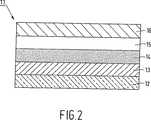 図2は、EL装置11の断面を、縮尺通りではないが図式的に示す。この装置は次のようにして製造することができる。実施例2のポリマーの第四級化していない変種の先駆層を、実施例2で用いたITO層13を塗布したガラス基板12上に塗布した。その後、先駆層をある時間アルキル化ヨウ化メチル蒸気に暴露した。この結果前述の層はある深さまで第四級化され、これによりイオン層15を形成した。先駆層のアルキル化されていない部分は、付加的層14を形成した。その後、実施例2に記載したようにしてインジウム電極層16をイオン層15に設けた。先駆層をヨウ化メチル蒸気に暴露する時間を種々に変化させて、同様の方法で多くの装置を製造した。このようにして得た装置をある時間15Vの電圧で活性化し、その後5Vでの輝度及び有効寿命を測定した。この一連の測定の結果を次の表に示す。