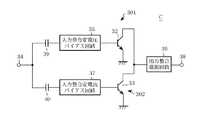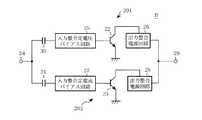 アンプ201は、RF入力端子24から入力された信号を、入力整合定電圧バイアス回路25を用いて整合し、容量性素子30を介してバイポーラトランジスタ22のベースに入力する。このときバイポーラトランジスタ22のベースには、入力整合定電圧バイアス回路25によって一定のベースバイアス電圧が供給されている。また、バイポーラトランジスタ22のコレクタには出力整合電源回路26によって電源電力が供給されている。バイポーラトランジスタ22が増幅した信号は、出力整合電源回路26によって出力整合が行われ、出力整合電源回路28から出力された信号と共にRF出力端子29に出力される。なお、バイポーラトランジスタ22のエミッタは接地されている。