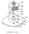 前記ブラシレスモータ45は、図6に一部を破断した斜視図に示すように、前記下ハーフ41Dのボス穴414にスラスト軸受451及び軸受スリーブ452によって軸転可能に支持された回転軸453と、前記回転軸453の周囲において前記プリント基板42に固定支持されたステータコイル454と、前記回転軸453に固定されて前記ステータコイル454を覆うように被せられた円筒容器状のロータ455とを備えている。前記ロータ455はロータボス456により前記回転軸453に固定され、かつ内面には円筒状のロータマグネット457を一体に有している。前記ステータコイル454は円周方向に等配された3対のコイルで構成され、各対のコイルは前記プリント基板42の図外のプリント配線を介して給電され、当該給電により円周方向に交互にS極とN極とに磁化される構成である。前記ロータマグネット457は前記ステータコイル454に対応して円周方向に交互にS極とN極とに着磁されている。このブラシレスモータ45では、前記ステータコイル454の3つのコイルに対して位相の異なる交流、すなわち三相交流を供給することによって前記ロータマグネット457、すなわち前記ロータ455及び回転軸453を回転駆動させるものである。さらに、図6に示されるように、前記プリント基板42には前記ロータ455の円周方向に沿って所要の間隔で並んだ複数個、ここでは3個のホール素子H1,H2,H3が配列支持されており、前記ロータ455と共にロータマグネット457が回転されたときに各ホール素子H1,H2,H3における磁界が変化され、各ホール素子H1,H2,H3のON,OFF状態が変化されてロータ455の回転周期に対応したパルス信号を出力するように構成されている。