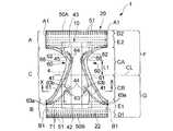 ここで、展開且つ伸長状態とは、各部の弾性部材を伸長させて、設計寸法(弾性部材の影響を一切排除した状態で平面状に広げたときの寸法と同じ)となるまで拡げた状態をいう。腹側領域の両側縁部と背側領域の両側縁部とが互いに接合されているパンツ型おむつの場合は、サイド接合部を引き剥がして(サイド接合部がない場合は着用者の左右側部に位置するおむつ側部を切断して)、おむつを展開状態とし、その展開状態のおむつを、各部の弾性部材を伸長させて、設計寸法(弾性部材の影響を一切排除した状態で平面状に広げたときの寸法と同じ)となるまで拡げた状態をいう。本明細書に記載の各部の寸法や角度等は、特に説明しない限り、展開且つ伸長状態のおむつについて測定する。 Here, the expanded and expanded state refers to a state in which the elastic members of each part are expanded and expanded to the design dimensions (same as the dimensions when expanded in a planar shape with all the influence of the elastic members removed). Say. In the case of a pants-type diaper where both side edges of the ventral region and both side edges of the back region are joined together, the side joints are peeled off (if there are no side joints, the left and right sides of the wearer) Cut the diaper side part located in the diaper, put the diaper into the unfolded state, and expand the elastic member of each part of the unfolded diaper into a flat shape without any influence of the elastic member It is the same as when it was expanded). Unless otherwise specified, the dimensions, angles, and the like of the respective parts described in this specification are measured for the diaper in the expanded and extended state.