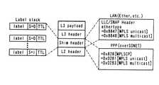 シムヘッダには、図3に示すように、ラベルの他、TTL やラベルスタック用のポインタSが付与されている。ラベルスタックは、ラベルの階層化のために用いられ、このラベルスタックを用いることにより、例えばMPLSドメイン内で複数のMPLSドメインを階層化してネットワークを構築することができる。図3では、S =1 であると、それが最後のラベルであると認識されるようになっている。