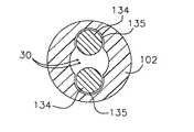 リードワイヤ30は従来技術により先端電極38とリング状電極40に接続する。好ましくは、リードワイヤ30ははんだ等で先端電極38と接続する。好ましくは、リードワイヤ30は以下のようにしてリング状電極40と接続する。始めに、チューブ24に小さな孔を開ける。例えば、針をチューブ24に挿入し十分に針を加熱して永続的な孔を形成して、このような孔を形成する。次に、リードワイヤ30をマイクロホック等を用いて孔に引き込む。リードワイヤ30の端のコーティングを剥がしてリング状電極40の下側に溶接する。その後、これを孔の所定の位置に移してポリウレタン接着剤等を用いて所定の場所に固定する。