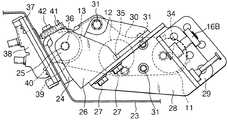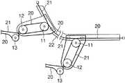 図10に示した別の実施例では、第3プーリー13は、スライド扉17(又は車体14)に直接軸止され、ローラーアームユニット10は、第2プーリー12の第2プーリー軸35の軸芯を中心に首振りするように構成されている。また、開扉用ケーブル20及び閉扉用ケーブル21は、第1プーリー11と第2プーリー12との間では交差させずに、第2プーリー12と第3プーリー13との間のみで互いに交差させてある。この実施例では、ローラーアームユニット10が首振りした場合、巻き取られる側のケーブル20又は21と第2プーリー12との接触面(巻取側巻付き角)が徐々に小さくなり、引き出される側のケーブル21又は20と第2プーリー13との接触面(引出側巻付き角)は徐々に大きくなる。  In another embodiment shown in FIG. 10, the