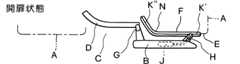 これに対して、特開2001−336352号公報には、図4のように、センターローラーアームユニットHに2個のプーリーL’、L”を設け、開扉用ケーブルK’と閉扉用ケーブルK”をプーリーL’とプーリーL”との間で互いに交差させることで、センターローラーアームユニットHが彎曲部Nの影響で首振りしても、巻取側ケーブルの経路長と引出側ケーブルの経路長の合計が変動しないようにしたセンターローラーアームユニットHの構成について開示されている。On the other hand, in Japanese Patent Laid-Open No. 2001-336352, as shown in FIG. 4, the center roller armunit H is provided with two pulleys L ′ and L ″, and a door opening cable K ′ and a door closing cable K are provided. Even if the center roller armunit H swings under the influence of the bent portion N by crossing each other between the pulley L ′ and the pulley L ”, the path length of the winding side cable and the path of the drawing side cable long total discloses a configuration of the center roller armunit H was not to change the.