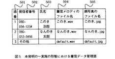 発信者番号の欄502から”090−012−3456”(図4における発信者番号フィールドの設定値)を検索する。着信メロディの欄504のなかで対応する着メロは”この木なんの木(ファイル名:なんのき.wav)”である。これが着メロに決定される。顔写真についても顔写真の欄のなかから、同様にファイル名“なんのき.jpg”に決定する。
