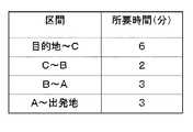 続いて、移動体端末は、該障害物の作動スケジュールを交通信号情報データベース9又は踏切情報データベース10から取り出して、上記したステップA14で得られた到着時間とを照合し、該次なる障害物における待ち時間を算出する(ステップA15)。そして、移動体端末は、上記したステップA14で得られた到着時間と、前記待ち時間とを加算して、自装置の位置(出発地)から出発した場合の該次なる障害物の経過時間を算出する(ステップA16)。