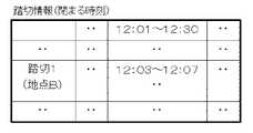図4は、踏切情報データベース10に格納される情報を説明するための図である。図4を参照すると、踏切情報データベース10は、地図上にある各踏切の遮断機が閉じている時間を時間帯毎に記憶保持している。例えば、場所Xにある踏切の5:01〜5:30の時間帯における遮断機が閉じている時間は5:22〜5:25である。もちろん、操作部4で入力することによって、踏切情報データベース10も、ユーザによって更新可能としてもよい。