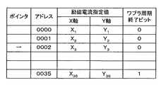 データ記憶部26には、図2に示すようなデータ構造を有するデータテーブルが設けられている。そして、データテーブルには、連番のアドレスに対してそれぞれ3つのデータ領域と1つのポインタ領域が設定されており、2つのデータ領域には、X軸励磁電流指定値とY軸励磁電流指定値とが格納されている。また、残りの1つのデータ領域は、螺旋周期終了ビットと称し、そこには螺旋周期の終了を表すデータが格納されており、螺旋周期の終了のアドレスのとき「1」が格納されていて、それ以外は「0」が格納されている。
