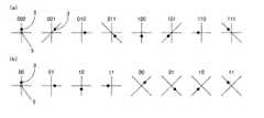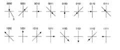 図12(b)では、0000から1111までの4ビットの値を表現している。仮想格子点5に対して+y方向が1の位、+x方向が2の位、−y方向が4の位、−x方向が8の位を意味しており、それぞれ、情報ドットを配置した場合を1、情報ドットを配置しなかった場合を0とする。例えば、情報ドットがどの位置にも配置されていない場合は0000である。また、+y方向と+x方向にのみ配置されている場合は、1の位と2の位が1、4の位と8の位が0であるから、0011となる。  In FIG. 12B, 4-bit values from 0000 to 1111 are represented. When the + y direction is the 1st place, the + x direction is the 2nd place, the -y direction is the 4th place, and the -x direction is the 8th place with respect to the
