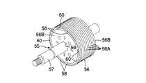 複数例えば2枚の第2ロータコア板56Bは、いずれも同一構成であり、図8に示すように第1ロータコア板56Aの同一の外形形状をなす円形状の外形を有し、その周部にマグネット58の取付け部、例えば、孔要素60bが複数開けられているとともに、中央部に軸通孔要素59bが開けられている。孔要素60bはロータコア板56Bの周面に沿う円弧状である。この孔要素60bは前記凹み61に相当する部分を有していない。この点で、第2ロータコア板56Bの孔要素60bと第1ロータコア板56Aの孔要素60aとは互いに異なる構成となっている。
