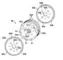 図6中符号51はステータを示している。このステータ51は、多数枚のステータ板を積層して略円筒状をなしている。このステータ51の内周面には複数の突極52が一体に求心方向に突設されている。これら突極52の夫々には界磁を作る励磁コイル53が巻きつけられている。各突極52の先端部は円形の配置で並んでおり、これらで区画される状態の内側空間からなるロータ通孔54をステータ51がその中央部に有している。ステータ51の両端にはこのステータ51を支持する図示しないモータフレームが夫々ねじ止めなどにより連結され、両モータフレームは軸受ブラケットとして機能するものであり、それらの中央部には夫々軸受(図示しない)が取付けられている。