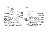 マグネット26は、各孔要素28a、28bの縁28af、28bfを埋めて設けられている。言い換えれば、ステータコア板25A、25Bの積層方向に沿ってロータ通孔28の内周面に作られた凹凸を埋めてマグネット26が取付けられている。この取付け状態を図4(B)に示す。