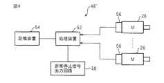 図4は、図1のロボットシステム10で使用される他の実施形態のロボット姿勢検出装置48´を示している。本実施形態のロボット姿勢検出装置48´は、CPUなどの処理装置52と、これに接続された不揮発性メモリなどの記憶装置54と、ロボット24の各軸又は関節を駆動するための動作用モータ26に取り付けられた位置検出器56と、動作信号回路46の接点50を開閉するための非常停止信号出力回路58とにより構成されている。制御装置30は、ロボット24の各軸の動作用モータ26に取り付けられた位置検出器56によって検出された角度情報に基づいてロボット24の各軸の位置(角度)や速度を制御している。すなわち、各軸の動作用モータ26に取り付けられた位置検出器56によって検出された角度情報に基づいて、ロボット24の姿勢を求めることができる。  FIG. 4 shows a robot