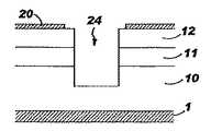 図6〜12は、この実施の形態のハードマスクを用いるデュアル・ダマシン・プロセスにおける工程を説明する。レジスト層21をハードマスクの上に付着し、金属配線のパターンをそこに現像する。Cl2 またはCl2 /BCl3 化学物質(chemistry)を用いて層20に開口部22をエッチングすることにより、配線レベル・パターンをマスクへ転写する(図6)。次に、当業者に周知の方法を用いて、レジスト層21をストリップし、レジスト残留物を除去する。次に、第二のレジスト層23をマスクの上に付着し、バイア開口部24のパターンをそこに現像する(図7)。酸化物層13と比較して、層20は小平面の形成がはるかに少なく、導入されるトポグラフィがはるかに少ない(図3と図7を対比されたい)。